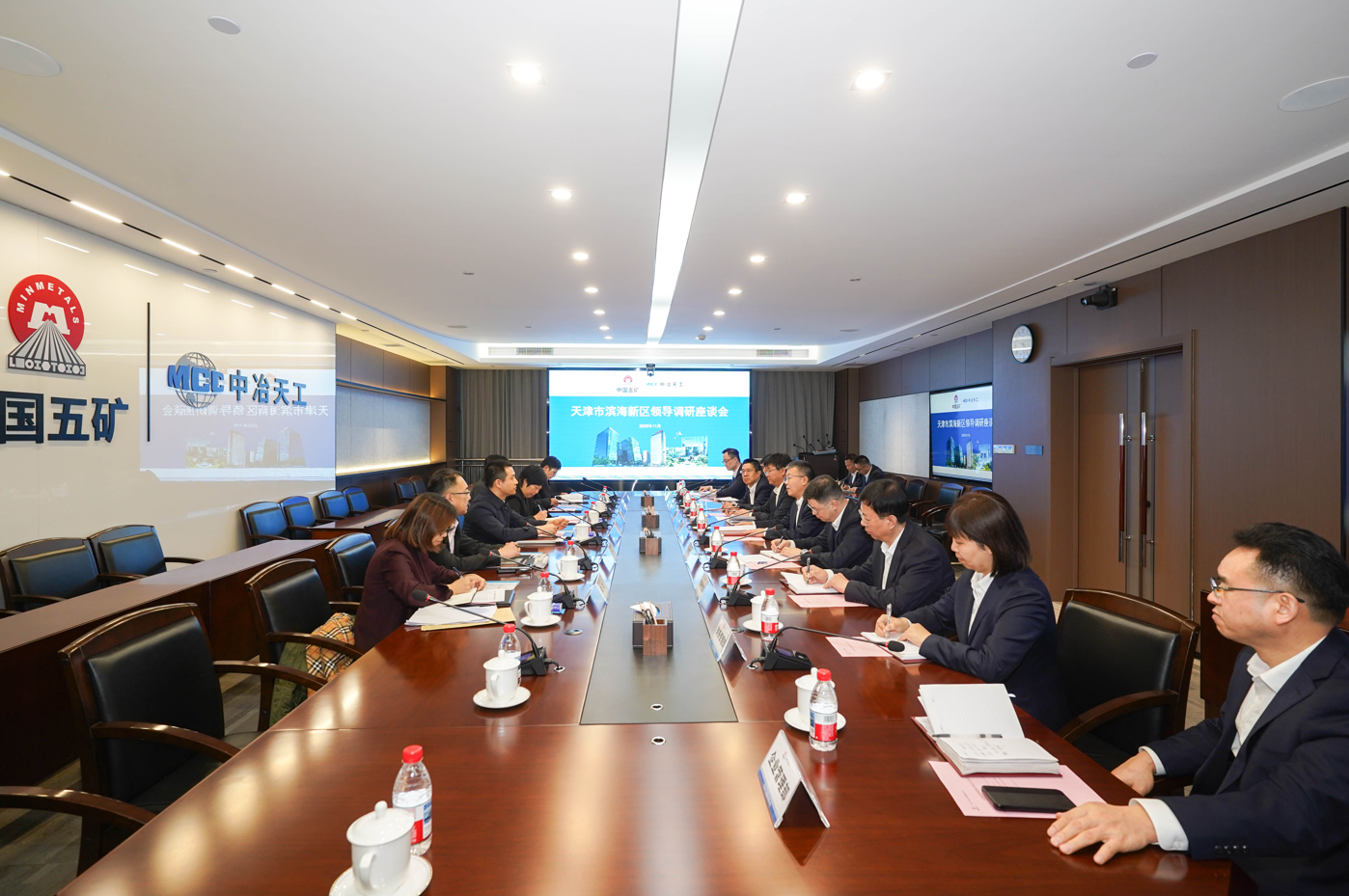 11月20日,天津市濱海新區副區長陳華榮帶隊深入中冶天工開展調研并座談交流,了解企業發展態勢、在津項目建設進展及實際發展訴求,中冶天工黨委書記、董事長高文華陪同調研。