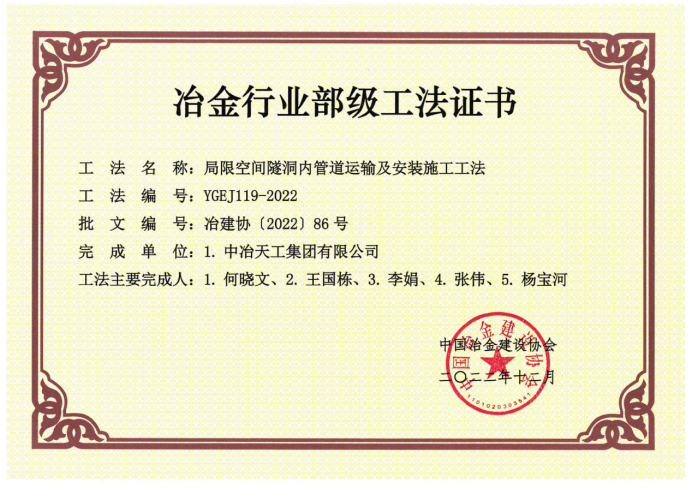 北方公司《局限空间隧洞内管道运输及安装施工工法》 荣获冶金行业部级工法证书