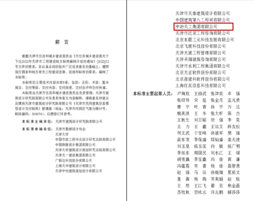 近日,中冶天工參編的《天津市民用建筑信息模型設(shè)計交付標(biāo)準(zhǔn)》(DB/T29-319-2024)經(jīng)天津市住房和城鄉(xiāng)建設(shè)委員會批準(zhǔn),正式發(fā)布實施。標(biāo)準(zhǔn)的發(fā)布實施彰顯了中冶天工在BIM技術(shù)領(lǐng)域的綜合實力,增強了天工BIM品牌的影響力和競爭力,為進(jìn)一步提升中冶天工在BIM領(lǐng)域的引領(lǐng)地位奠定了堅實基礎(chǔ)。