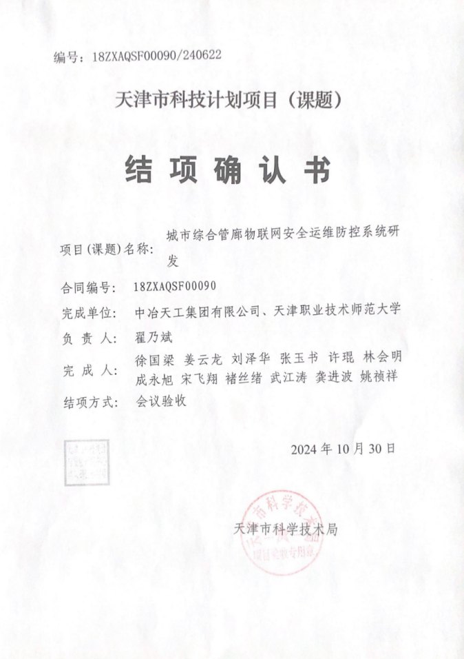 近日,由中冶天工承擔的天津市科技計劃項目《城市綜合管廊物聯網安全運維防控系統研發》通過結項驗收。該項目歷經數年艱苦攻關,系統地解決了基于物聯網技術的地下綜合管廊及管線在運行使用過程中的風險評估和安全監管問題,并取得了一系列重要的科研成果,為推動管廊運維技術領域的進步和產業發展作出了重大貢獻。
